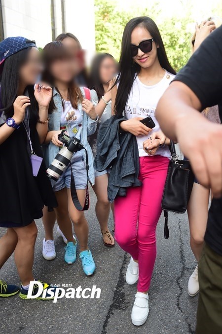 데뷔 5년차 그룹이면 친자매나 다름 없죠? 빅토리아와 크리스탈이 다정하게 팔짱을 끼고 등장했습니다. 더운 날씨에도 꼭 붙어 다니는 모습, '땀띠'는 "아이 돈~ 케어"였습니다.
