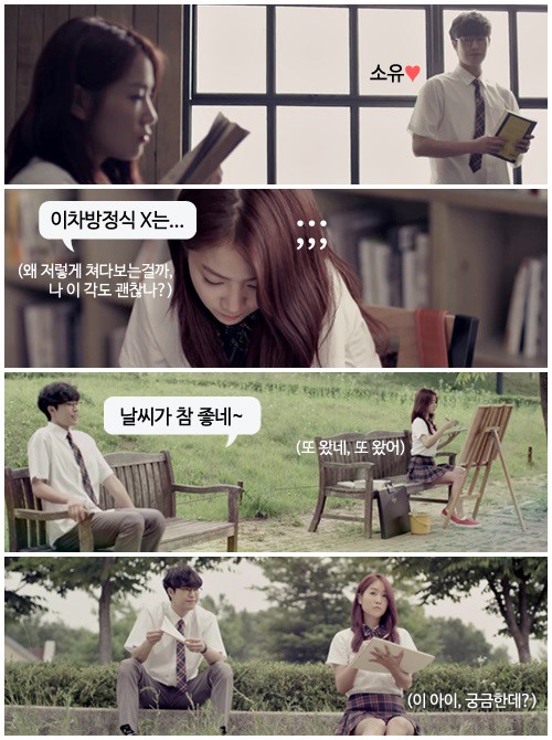 소유 가는 곳에 민우 있다! 도서관에서도, 교정에서도, 그림 그릴 때도. 늘 민우가 주변에서 맴돌고 있는 게 보이시죠? 예상대로, 민우는 저 소유를 짝사랑 중입니다.