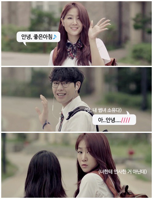 제 상대역 박민우씨 입니다. 최근 SBS-TV '룸메이트'에서 모델 기럭지를 뽐내고 계시죠. 뮤직비디오에서는 순수한 마음을 소유한 남학생으로 변신했습니다. 늘 저를 지켜보는 역할이죠.