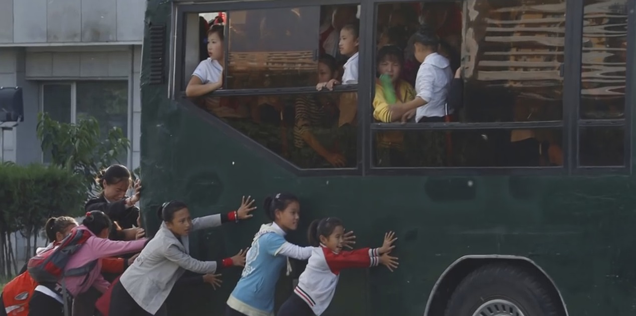 태양열로 가는 버스를 상용화했다고 자랑한 북한 이지만, 대부분의 버스들은 낡아서 쉽게 고장이 난다고 합니다. 버스를 미는 아이들과 어른들이 보이시나요?
