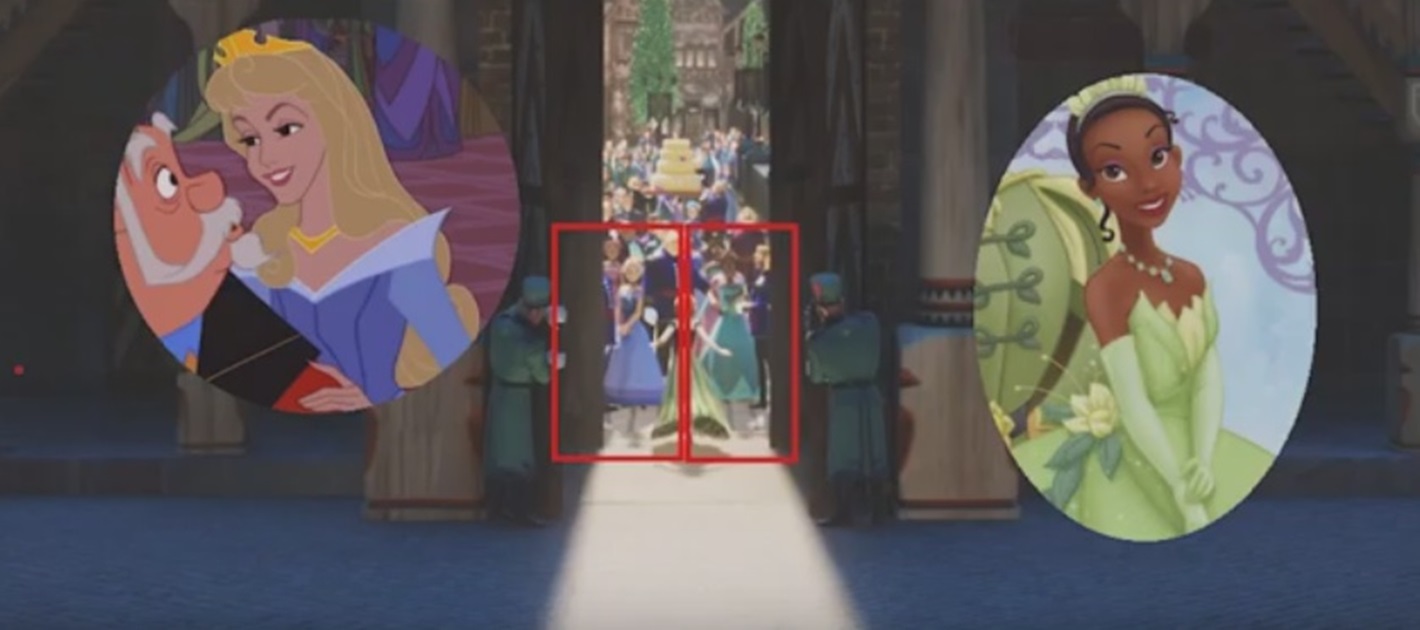 겨울왕국에서 안나가 궁전 문을 열고 나가는 장면을 보시면 잠자는 숲속의 미녀의 주인공 오라라 공주와 공주와 개구리의 주인공 티아나공주가 카메오로 등장합니다.