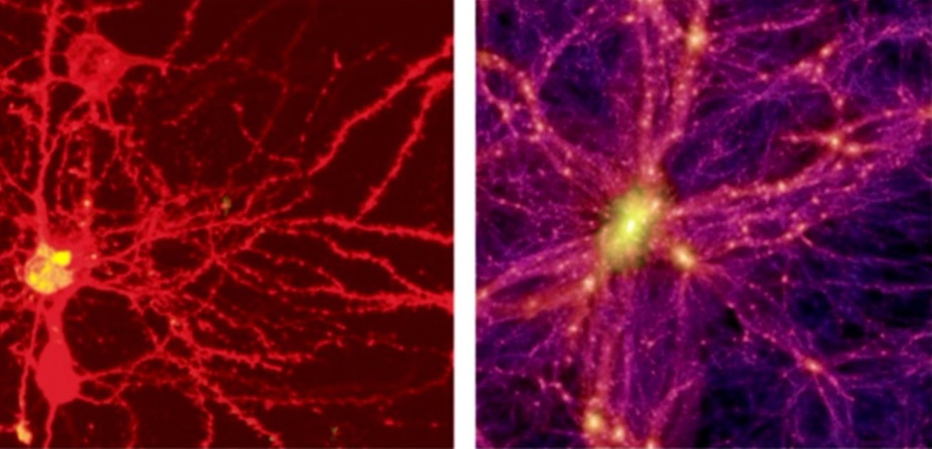 (좌 우주의 은하단, 우 인간의 뇌 시냅스)