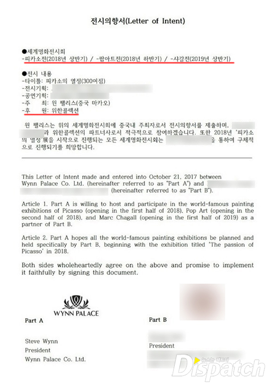 '디스패치'는 전준주가 뿌리고 다니던 전시의향서도 입수했다. 타이틀은 '피카소전', '팝아트전', '샤갈전'. 주최는 '윈 팰리스'(마카오), 후원은 '위한콜렉션'으로 돼 있었다.