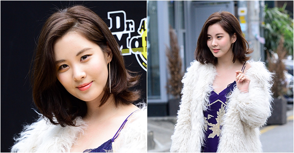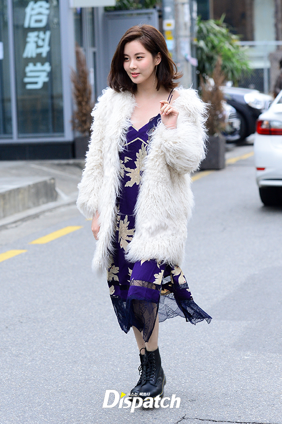 서현은 란제리룩과 퍼코트, 워커를 매치해 남다른 패션감각을 뽐냈다.