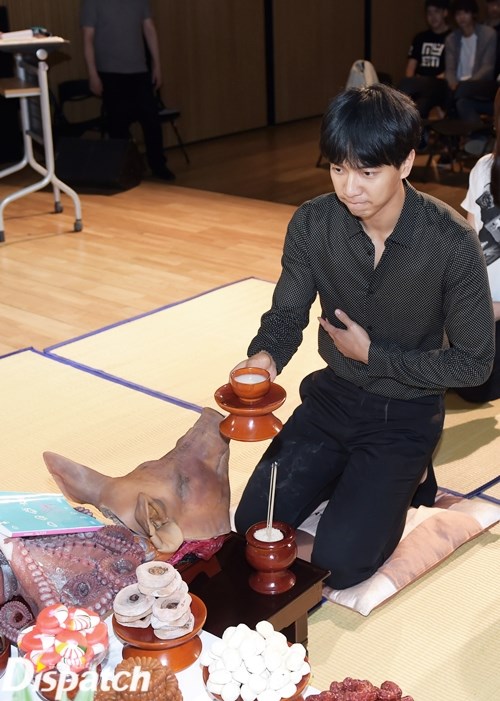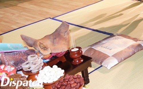 무사히(?) 절을 끝낸 이승기. 이번에는 고이 접은 축문을 꺼내 돼지의 입에 꽂습니다. 두 번 실수는 없었습니다. 능숙하게 고사를 이어 나갔습니다.