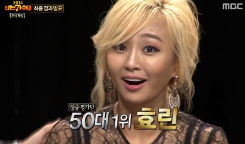 결국 최종 평가에서 30대·50대 투표 1위라는 쾌거를 일궈냈습니다. 최종 평가에서는 더원의 뒤를 이어 2위까지 차지했습니다. 효린 자신도 믿겨지지 않는지 얼떨떨한 표정을 짓더군요.