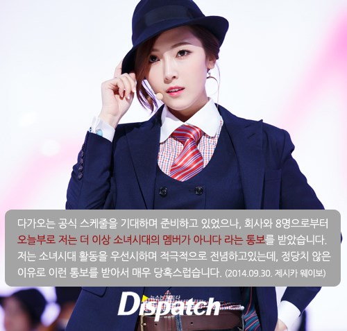 "다가오는 공식 스케줄을 기대하며 준비하고 있었으나, 회사와 8명으로부터 오늘부로 저는 더 이상 소녀시대의 멤버가 아니라는 통보를 받았습니다. 저는 소녀시대 활동을 우선시하며 적극적으로 전념하고있는데, 정당치 않은 이유로 이런 통보를 받아서 매우 당혹스럽습니다."