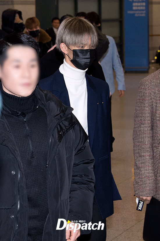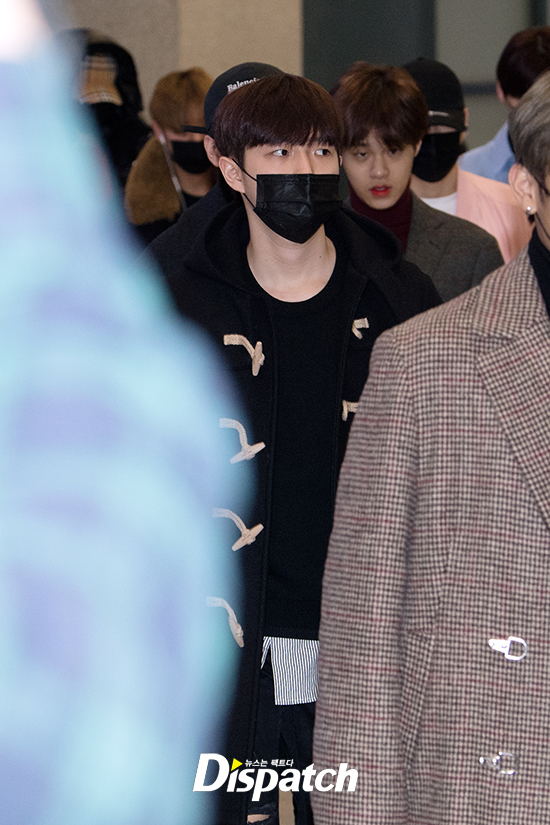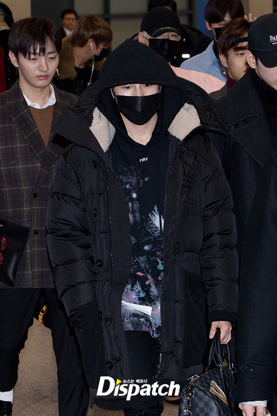 '워너원'은 이날 완정무장 패션으로 공항에 들어섰다. 검정색 마스크로 민낯을 완벽히 사수했다.