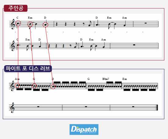 '주인공'과 '파이트'의 멜로디는 어떨까. '주인공'의 경우 브릿지 첫 마디에 '도도도도시(솔)라'를 사용한다. '파이트'는 '도도도시(라)라'다. '솔'과 '라', 단 한 음 차이다.