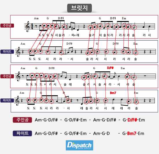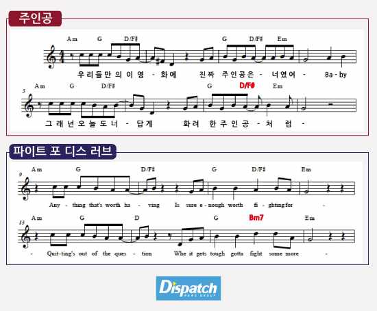 브릿지에 사용된 코드는 12개. 11개의 코드가 일치한다. 진행 패턴이 똑같다. 11번째 코드만 '살짝' 다르다. '주인공'은 'D/F#'을, '파이트'는 'Bm7' 코드를 썼다.