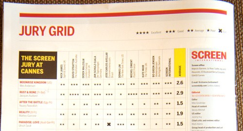 칸 영화제 기간 발행되는 영국 영화전문 데일리 잡지 '스크린 인터내셔널'은 19일(현지시간)자 보도에서 개막작 '문라이즈 킹덤'과 '재와 뼈', '애프터 더 배틀', '리얼리티', '파라다이스 : 러브' 등 총 5개의 상영작에 대한 평점을 공개했다.