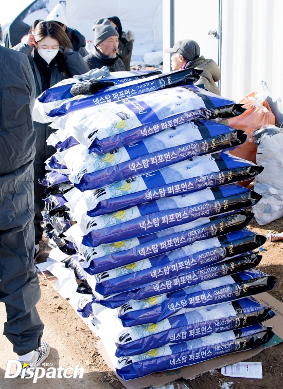 강아지들을 줄 선물도 마련했습니다. 사료 30포대를 준비했습니다. 총 450kg으로, 60마리의 강아지가 10일간 먹을 수 있는 분량입니다.