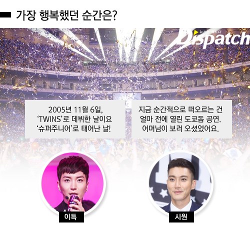 "딱 하루를 꼽자면, 2005년 11월 6일 '트윈스(TWINS)'로 데뷔한 날인 것 같습니다. 정말 하고 싶었던 일이고, 많은 걱정과 불안 속에서 지내다 '슈퍼주니어'라는 이름으로 다시 태어난 그 순간 말입니다. 제일 행복하고 즐겁고 설레고 떨렸던 순간이었습니다." (이특)