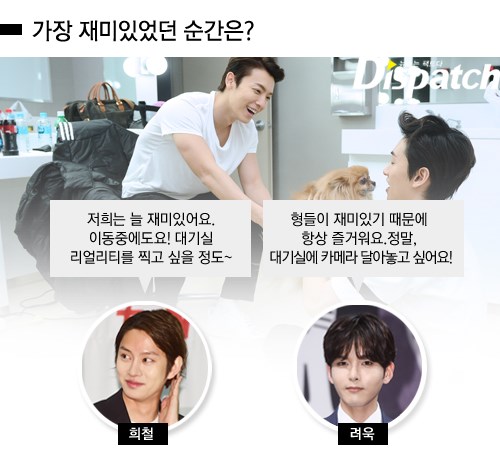 "가장 재미있었을 때보다 가장 재미없을 때를 물어보는 게 더 빠르지 않을까요? 저희는 이동 중에도 무척 재밌게 놀기 때문에 ㅋㅋ. 대기실 리얼리티를 한 번 찍고 싶어요." (희철)