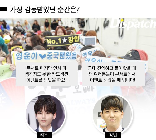 "군대 전역하고 돌아왔을 때, 팬분들이 콘서트에서 이벤트 해줬을 때, 정말 감동받았어요." (강인)