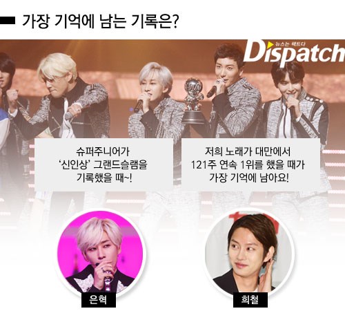 "슈퍼주니어라는 이름으로 처음 1위를 했을 때. 2006년 6월 25일 SBS '인기가요'에서 처음 1위를 받았던 순간이지 않을까 생각이 듭니다. " (은혁)