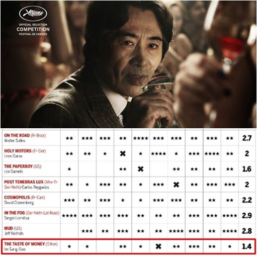[Dispatch=김수지기자] 영화 '돈의 맛(임상수 감독)'이 제 65회 칸국제영화제 경쟁부문 진출작 중 최저평점을 기록했다. 영화제 공식 매거진인 '스크린데일리'로부터 1.4점을 얻는데 그쳤다.
