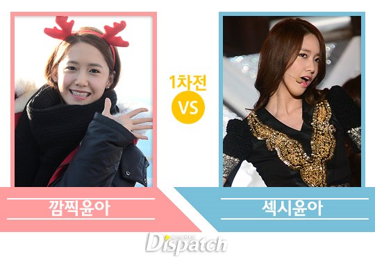 1차전, 깜찍 대 섹시 대결입니다. 시작부터 만만치 않죠? 평소 윤아의 모습은 깜찍합니다. 혀빼꼼, 뿌잉뿌잉은 기본입니다. 그런데, 무대에 서면 돌변합니다. 눈빛부터 섹시합니다.