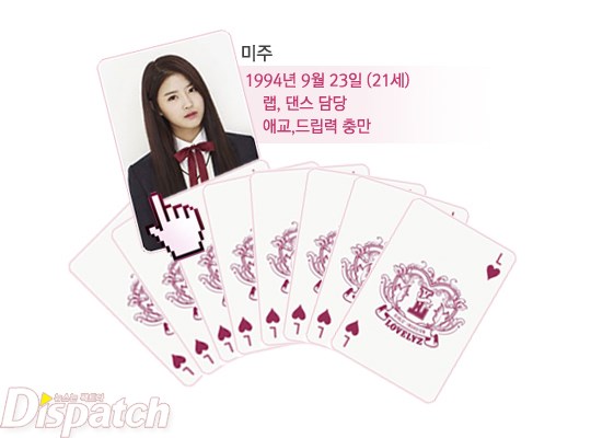 ☞ 미주 : 본명 이미주. 1994년 9월 23일생. 나이 21세. 팀내에서 랩과 댄스를 담당하는 멤버. 넘치는 애교와 드립력으로 팀 내 분위기메이커 역할을 톡톡히 수행 중입니다.