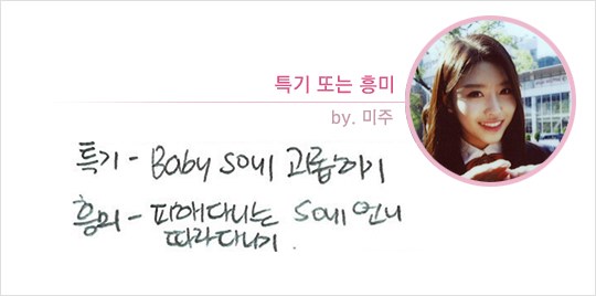 ▶ 자기 소개서를 보니, 모태 애교쟁이 라는데요. 팬 몰이가 예상됩니다. 슬픈 표정연기도 뛰어나답니다. 무대 위의 시선 강탈 예약. 계속 말을 걸어보고 싶은, 귀여운 목소리의 소유자.