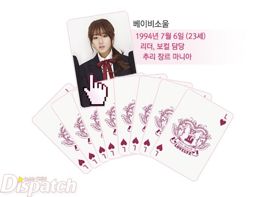 ☞ 베이비소울 : 본명 이수정. 1992년 7월 6일생. 올핸 나이 23세. 팀의 맏언니로, 리더입니다. '러블리즈'에서 보컬을 맡고 있죠. 지난 2012년 '인피니트' 동우와 '그녀는 바람둥이야'를 함께 불렀습니다.