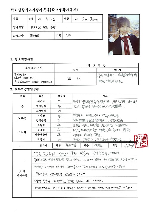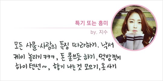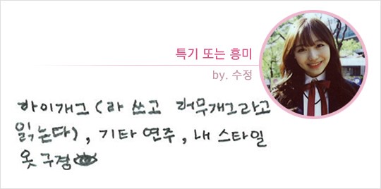 시시각각 허무개그로 멤버들을 즐겁게 해주는 게 수정의 낙이라고 합니다. 그 나이 또래 소녀들과 마찬가지로 쇼핑도 즐기는데요. 취미는 기타 연주라고 합니다.