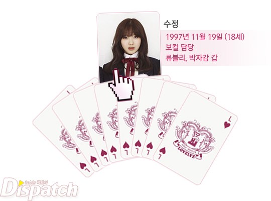 ☞ 수정 : 본명 류수정. 1997년 11월 19일생. 나이 18세. 팀 내 보컬을 맏고 있습니다. 러블리한 페이스 덕분에, 별명은 류블리. 팔자 주름 미소가 매력 포인트라고 하네요.