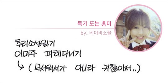특이점 하나. 좋아하는 건 추리소설 읽기입니다. 그래서인지 형사와 탐정을 동경하고 있었는데요. 멤버인 '미주' 피해 다니기가 특기입니다. 미주는 친한 동생인데요. 톰과 제리같은 사이라네요.