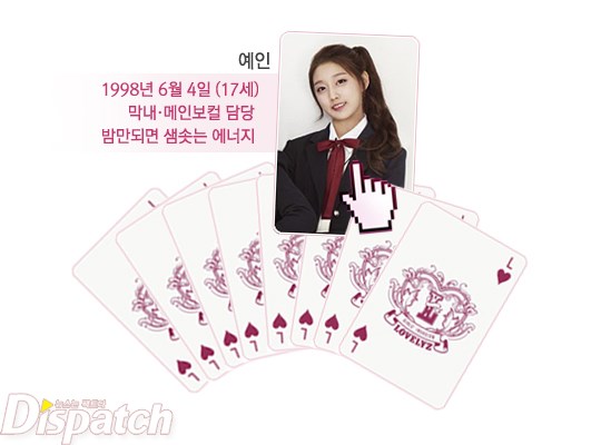 ☞ 예인 : 본명 정예인. 1998년 6월 3일생. 나이 17세. 팀내 막내지만, 의젓한 성격을 가지고 있습니다. 특히 우월한 기럭지를 자랑해 언니들의 부러움을 사고 있다고 하네요.