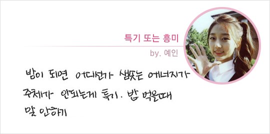 ▶ 셀프영업 좀 볼까요. 장래 희망은 슈퍼스타. 역시 뼛속까지 아이돌입니다.무대 위에서 탄탄한 하체가 돋보인다네요. 무엇이든 진지하게 임해서, 감정 몰입도 굿. 성대모사 능력도 상급.