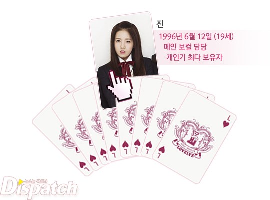 ☞ 진 : 본명 박명은. 1996년 6월 12일생. 올해 나이 19세. '러블리즈'의 메인 보컬. 개인기 최다 보유자. 무려 5개. 어떤 개인기인지는, 아직은 비밀~.