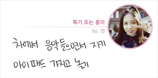 듣기만 해도 마음이 편해지는 취미. 메인 보컬 답게, 차에서 음악들으면서 잠들기가 자신의 취미라네요. 그리고 아이패드 가지고 놀기.
