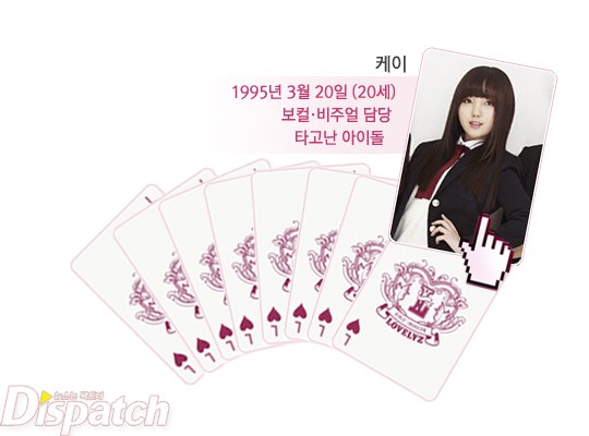 ☞ 케이 : 본명 김지연. 1995년 3월 20일생. 올해 나이 20세. '러블리즈'의 보컬과 비주얼 담당. 멤버들 모두가 '타고난 아이돌'이라며 입을 모을 정도로, 끼가 많은 케이.