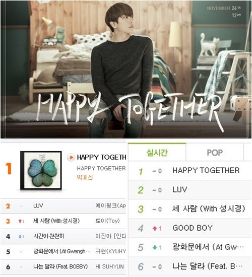 박효신의 '해피투게더'는 26일(오전 9시기준) 8개 음원 사이트 실시간 차트에서 1위를 기록했다. 멜론, 벅스, 네이버뮤직, 올레뮤직, 다음뮤직, 엠넷뮤직, 지니뮤직, 소리바다 등이다. 지난 24일 정오 음원을 발표한 이후 3일 연속 주요 음원사이트 1위를 지켰다.