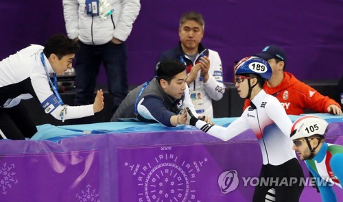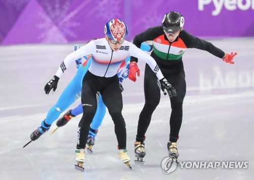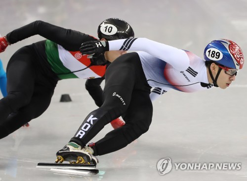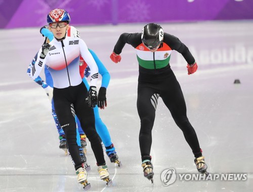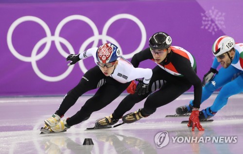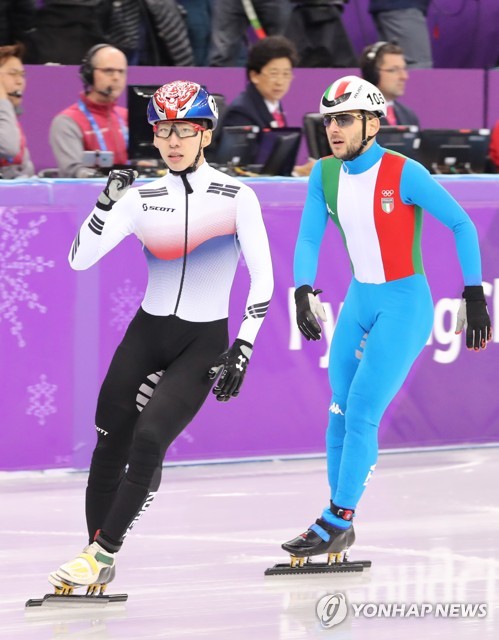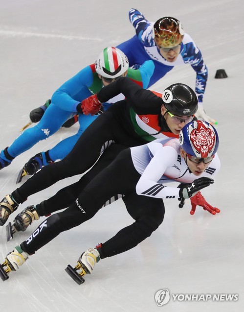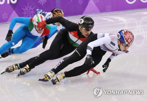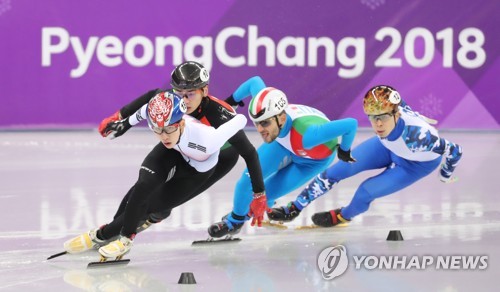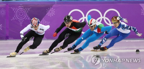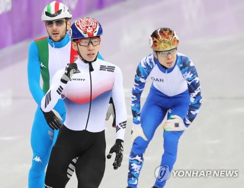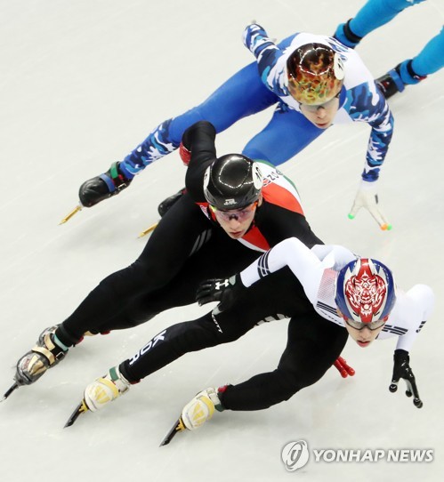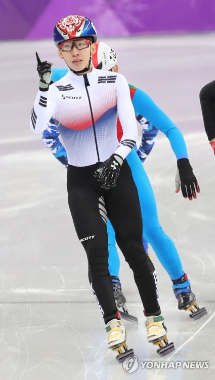 (강릉=연합뉴스) 김인철 기자 = 17일 강원 강릉 아이스아레나에서 열린 2018평창동계올림픽 쇼트트랙 남자 1,000m 준결승에서 한국의 임효준이 조1위로 결승선을 통과하고 있다. 2018.2.17