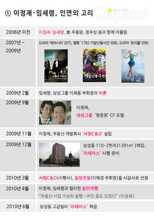 그 과정에서 임세령의 도움을 받았다. 2010년 4월 필리핀 동반 여행이 그 예. 이정재는 "함께 현지 빌라들을 둘러보고 왔다"고 말했다. 같은 해 6월, 이정재는 고급빌라 '라테라스' 착공했다.