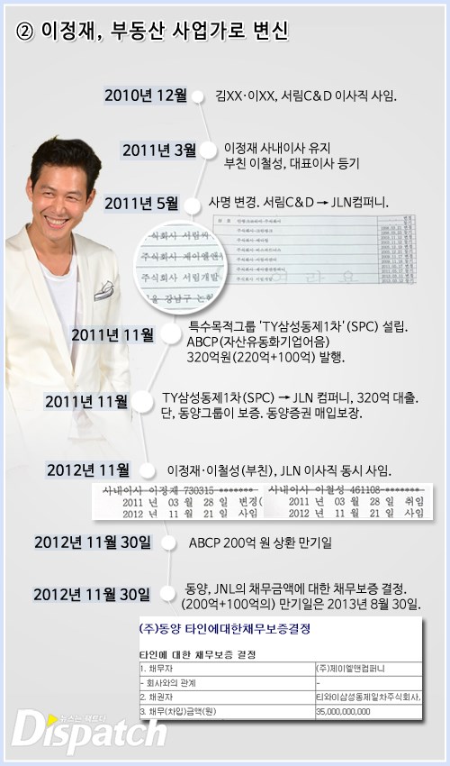 그렇다면 사업자금은 어떻게 충당했을까. 이정재는 지난 2011년 5월, 사명을 '서림 C&D'에서 'JLN 컴퍼니'로 변경했다. 본인은 사내이사, 부친인 이철성 씨가 대표이사 직을 맡았다.