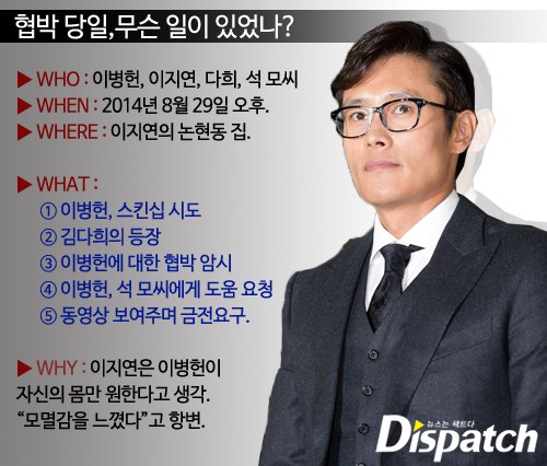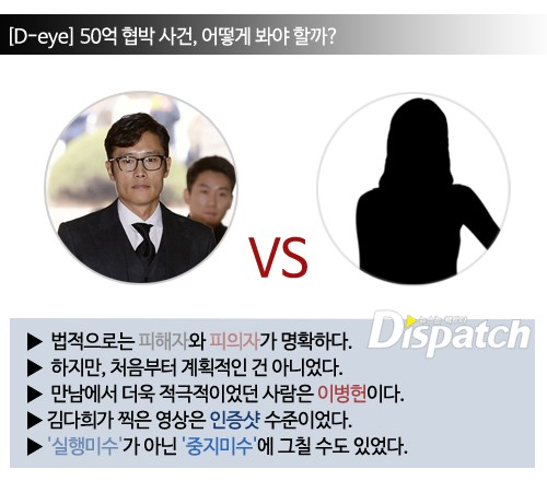 ③ 협박=김다희가 이병헌에게 "서론부터 말할까요, 본론부터 말할까요?"라고 함. 이병헌은 곧바로 그들을 소개해준 석 모씨에게 연락.