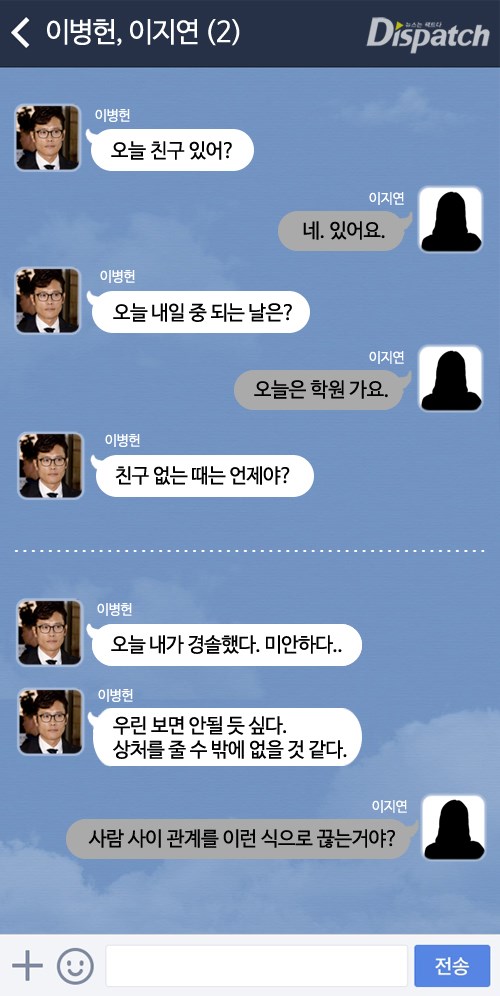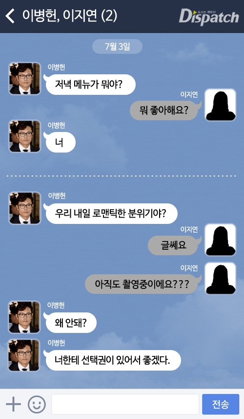 A는 배우 이병헌이고, B는 모델 이지연이다. 그리고 이는 '디스패치'가 입수한 두 사람의 대화를 재구성한 것이다.