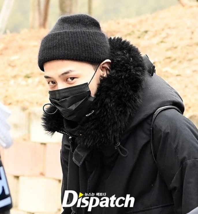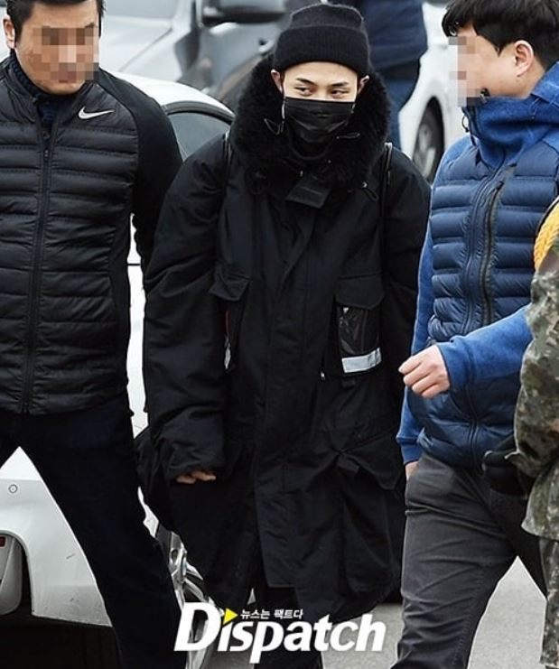 그는 이날 올블랙룩으로 나타나 큰 관심을 받았다. 검은색 비니, 마스크, 방한 외투 등으로 입대패션을 완성했다.