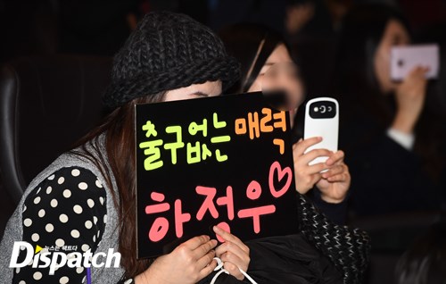 마이크를 잡는 순간 갑자기 폭발적인 함성이 쏟아졌습니다. "출구없는 매력 하정우"라는 플래카드까지 등장했습니다.