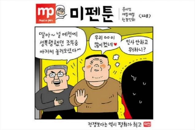 윤 씨는 지난달 23일 한 매체에 아버지로 보이는 남성이 딸에게 누군가를 소개하면서 '딸아∼ 널 예전에 성폭행했던 조두숭 아저씨 놀러 오셨다'라고 말하는 내용의 만화를 게재했다.