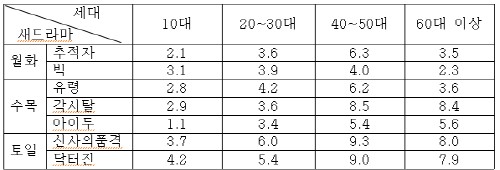 신작 드라마에 대한 세대별 선호도는 뚜렷이 갈렸다. 10대부터 60대까지, 나이에 따라 즐겨 보는 드라마가 각각 달랐다. 10대는 트렌디한 스타가 출연하는 드라마를 좋아했고 40~50대는 공감대가 형성되는 드라마에 빠졌다.