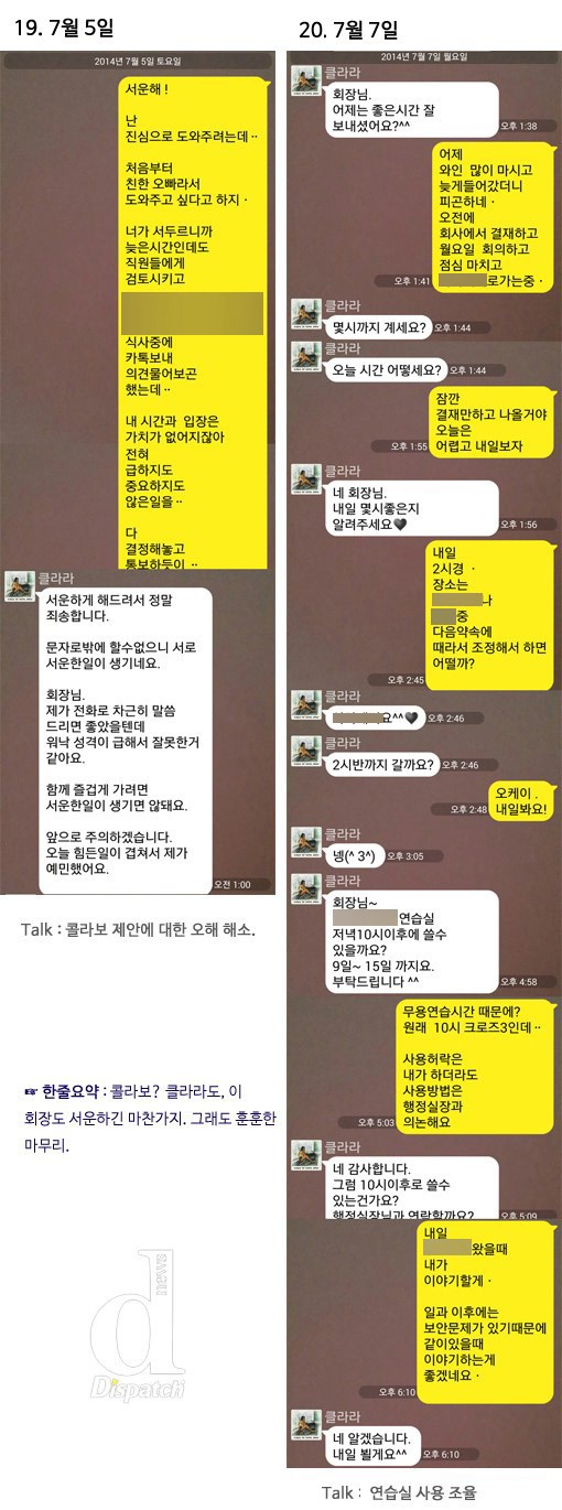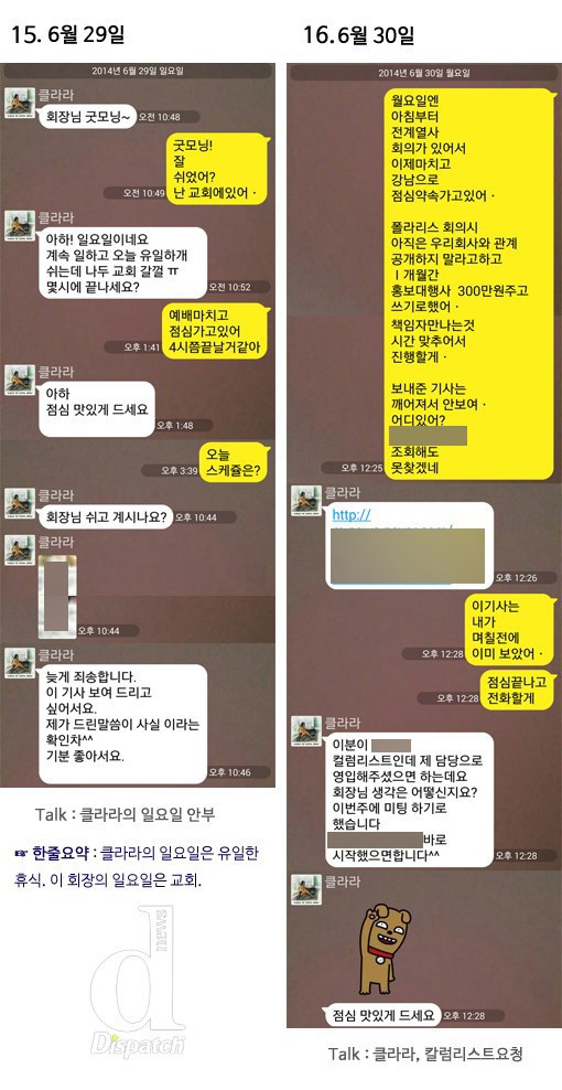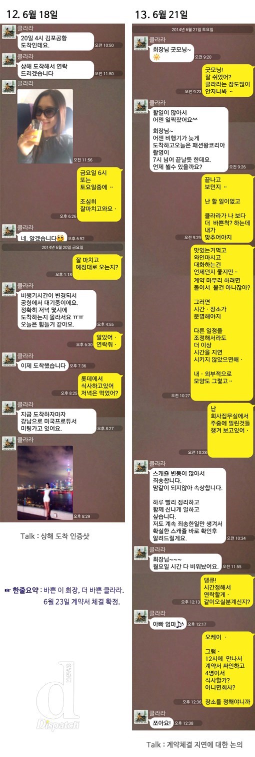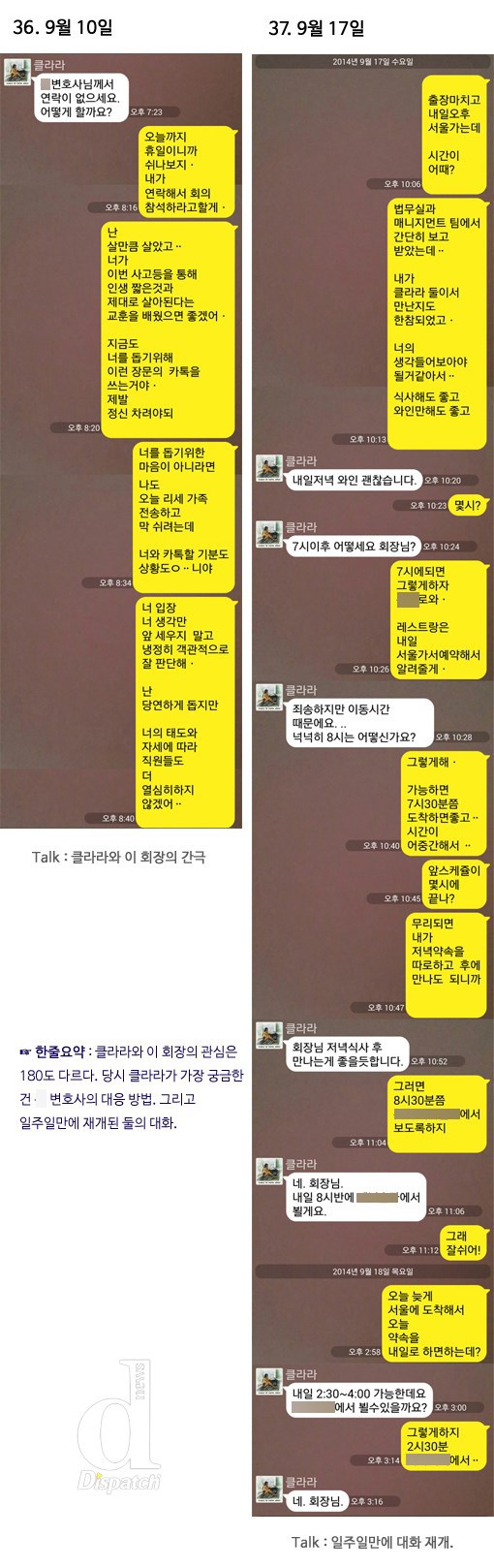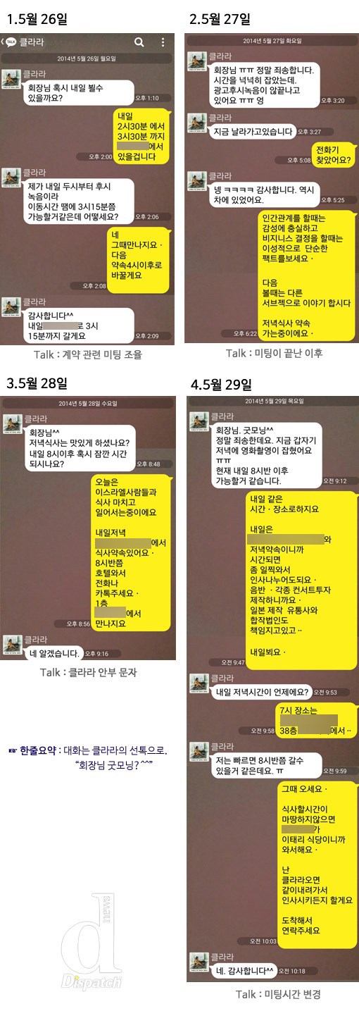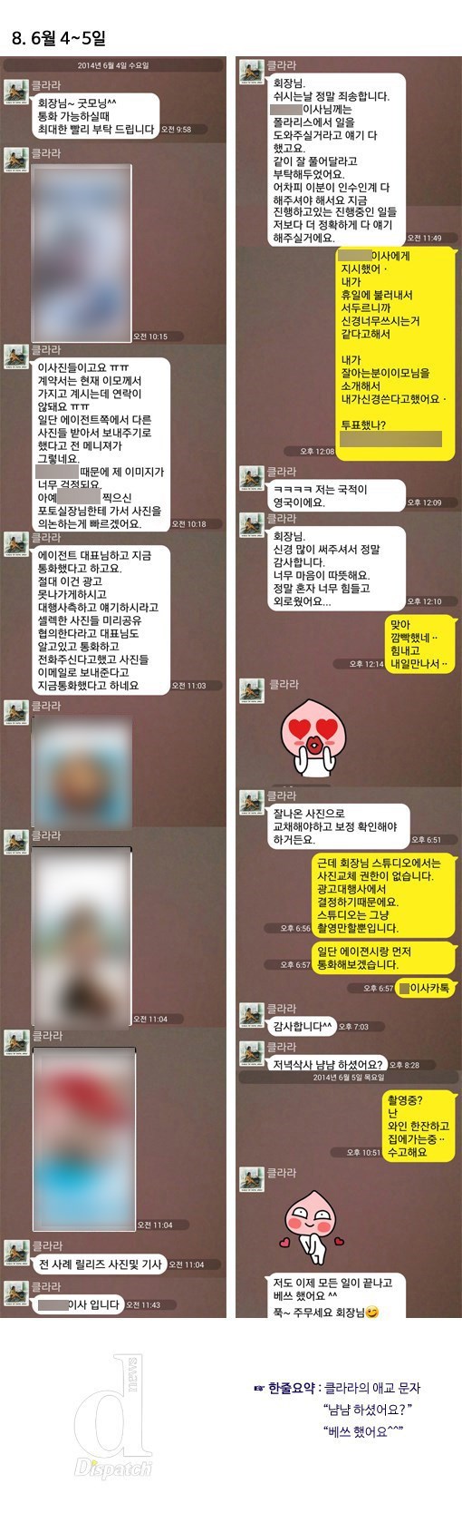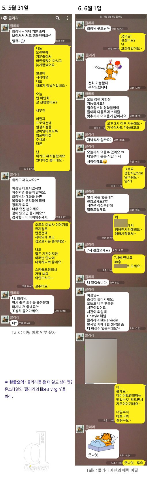 '디스패치'는 클라라와 '폴라리스' 이 회장이 지난 3개월 동안 주고 받은 문자의 일부를 공개했다. '시간순'이 아닌 '사건순'으로 재구성해 배열했다.