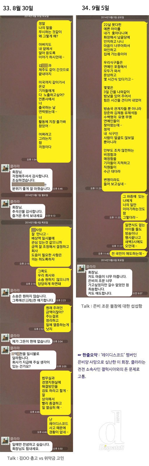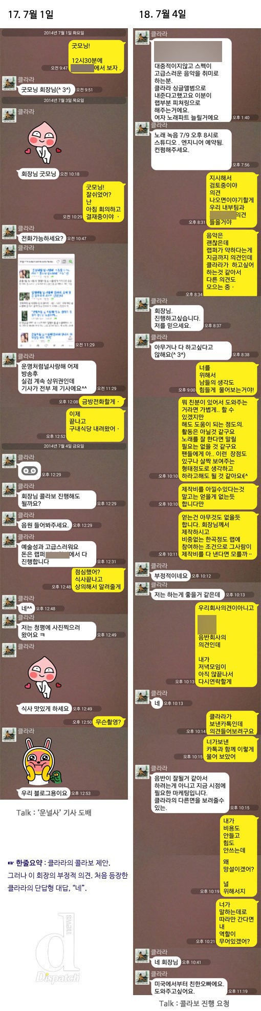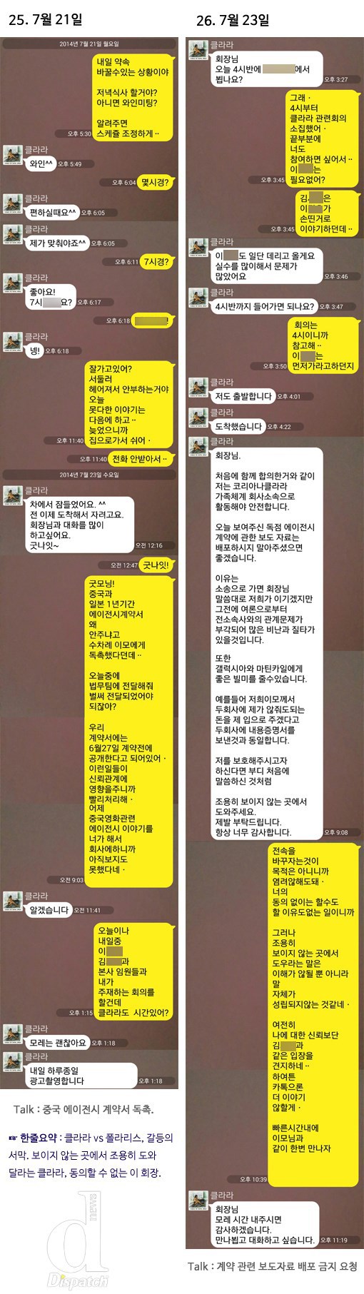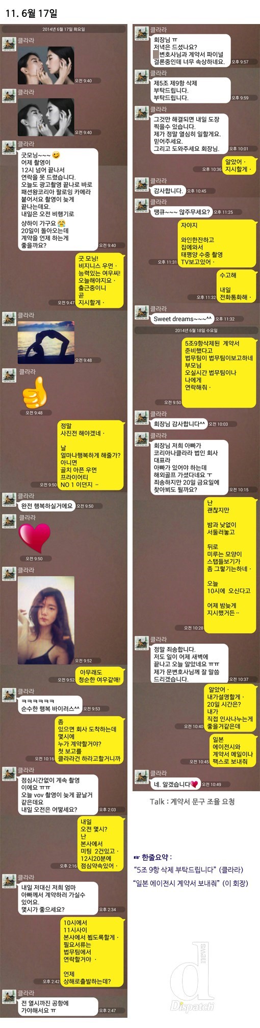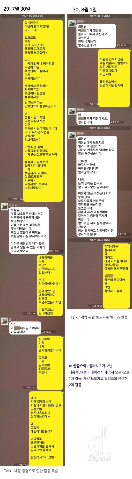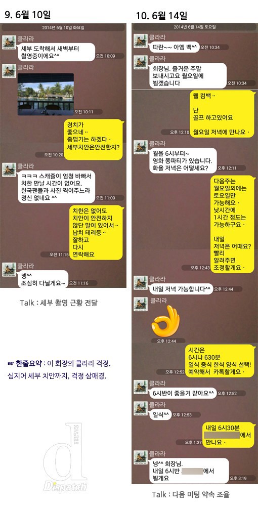 '디스패치'는 클라라와 '폴라리스' 이 회장이 지난 3개월 동안 주고 받은 문자의 일부를 공개했다. '시간순'이 아닌 '사건순'으로 재구성해 배열했다.