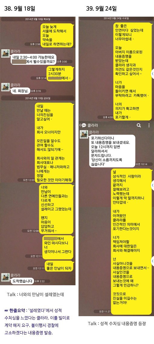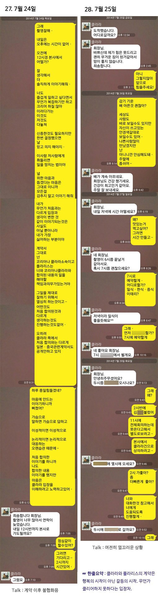 더 나아가, '계약을 해지해주지 않으면 경찰에 고소하겠다'고 으름장을 났다. 이는 폴라리스가 클라라를 협박 혐의로 고소한 이유다.