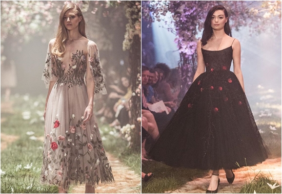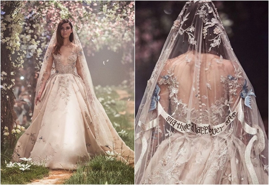 첫번째 드레스는 ‘잠자는 숲 속의 공주’에서 영감을 받아 제작한 작품. 애니메이션 탄생 59년을 기념하기도 했는데요. 꽃과 가지 자수 뿐만 아니라 OST 가사를 레터링해 의미를 한껏 살린 웨딩드레스입니다.