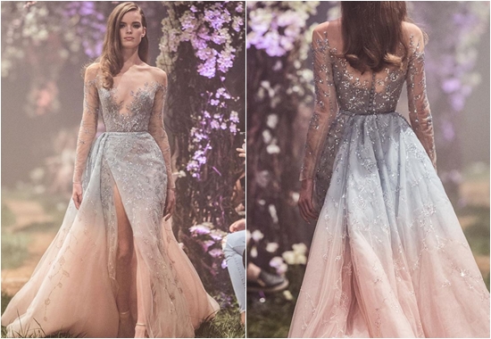 이번 드레스도 ‘잠자는 숲 속의 공주’ 스타일입니다. 블루와 핑크 컬러가 절묘하게 그라데이션된 드레스인데요. 왜 이 컬러였을까요? 애니메이션에서 요정들이 "Make it pink! Make it blue!"를 외치며 드레스를 만드는 장면 때문이라고 합니다.