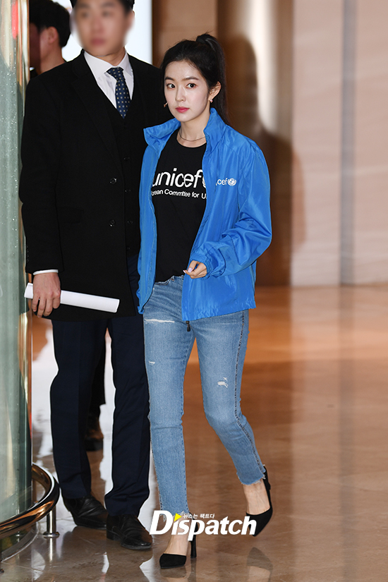 아이린은 청바지와 자원봉사자 유니폼, 하이힐로 남다른 각선미를 뽐냈다.