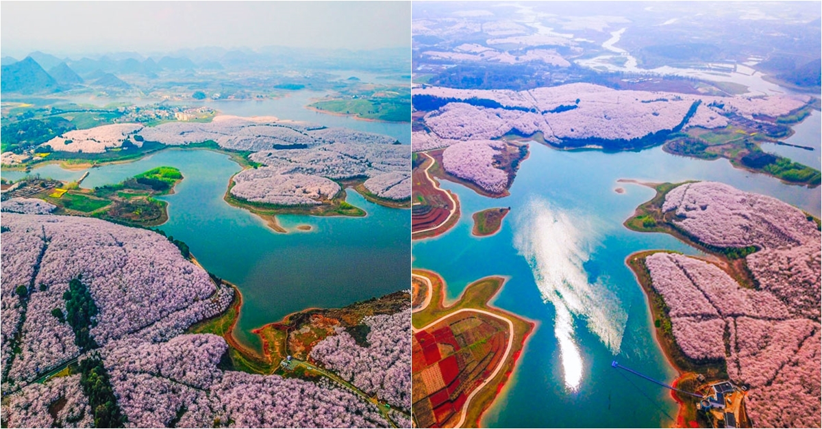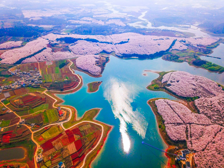 보어드판다에서 공개한 사진은 상공에서 바라본 벚꽃 컨셉트입니다. 새파란 물빛과 핑크빛 벚꽃이 어우러져 장관을 이루었는데요. 비주얼만 보면 벚꽃섬 수준.